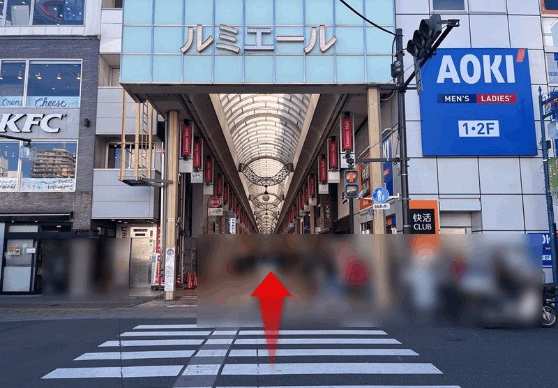 「南口」に向かって直進します。「南口」を出て横断歩道を渡り、ルミエール商店街に入ります。